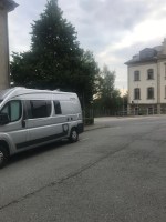 While walking around the square we noticed they were setting up stalls. Good old google told us it was a summer market to be held that evening with fireworks and Mediterranean stalls. So we took the decision to stay and then do our first wild camp. Firstly to find a spot. We still feel like we are possibly doing something wrong even though it’s quite acceptable to park overnight in a parking area and sleep. Anyway after a few attempts ( nearly an argument ) we decided on a spot right opposite the police station!