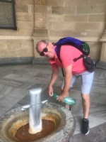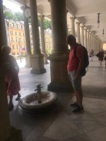 Karlovy Vary was one of Europe’s best known spa towns, especially when this was the thing for High Society to do. It was on the itinerary for wealthy socialites and the magnificent buildings in the town bear testament to this. Strung along a valley the town boasts a dozen really hot springs , each of which is supposed to cure a particular set of ills. I tried a little sip of one and the only ill is that it made me feel ill. Think rotten egg smelling, iron nail tasting and you start to get the picture. This was the easy one apparently. Rose seemed quite at home sipping from various taps along our walk. The town is very touristy, with a huge number of Asians being herded around by your guided holding umbrellas aloft.