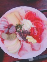 Large plate with local cheese, cured meats, pates, sliced apple and quince, tomatos, gherkin and bread. . . Heaven.