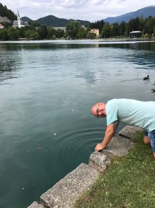 We park at the cemetery at Lake Bled and walk down to the path that goes all around the lake. It’s still, calm and warm. There is an island in the middle of the lake with a church. The story is that only a certain village people are allowed the license to operate these boats on the lake. They are called Pletna boats. As we arrive 3 boatloads of bride, bridegroom and wedding guests are pushing off. It’s quite popular to get married on the church on the island. How romantic!