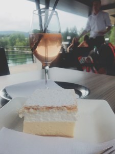 After our thrilling ride we walk back. We have to have a kremsnita. It’s the famous cream cake from the Lake Bled. We go to the ” original ” hotel that first started making them, the Hotel Park. The cake was like a custardy base with cream and crisp flaky pastry layers. It was good and there you go, cake for lunch again!