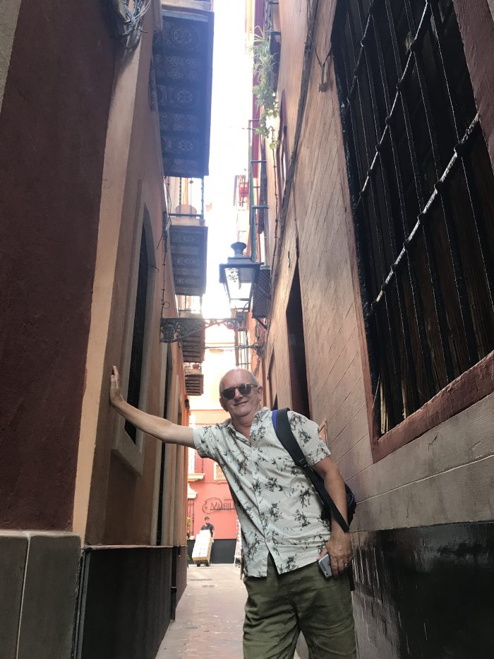 That day we finished off our sightseeing with a drink on the roof top of a hotel in the Barrio Santa Cruz (the old Jewish quarter ) It has so many narrow higgledy piggledy streets that you could easily get lost. Some of the streets are so narrow only one person can walk at a time.