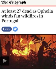 Whilst driving up here during the day we had noticed an awful lot of burnt vegetation and still smoldering country side; however it was only when my mother Emilie messaged me in a slight panic as to our whereabouts and safety that we realized So what we had not realized that the part of Portugal we were traveling through and into was in the grip of massive wild fires. Chris reads the news on the internet from cover to cover, but I think he concentrates more on Zuma and his shenanigans than the local Portuguese news. Now we watched the TV news and discovered just how devastating the fires had been, with reports of 31 people dying in the exact area we were headed! It had been drizzling fairly solidly and of course as we left the restaurant to go back to the campsite, the heavens opened with great crashes of thunder and flashes of lightning. Not good for our clothes but great news for the firefighters.